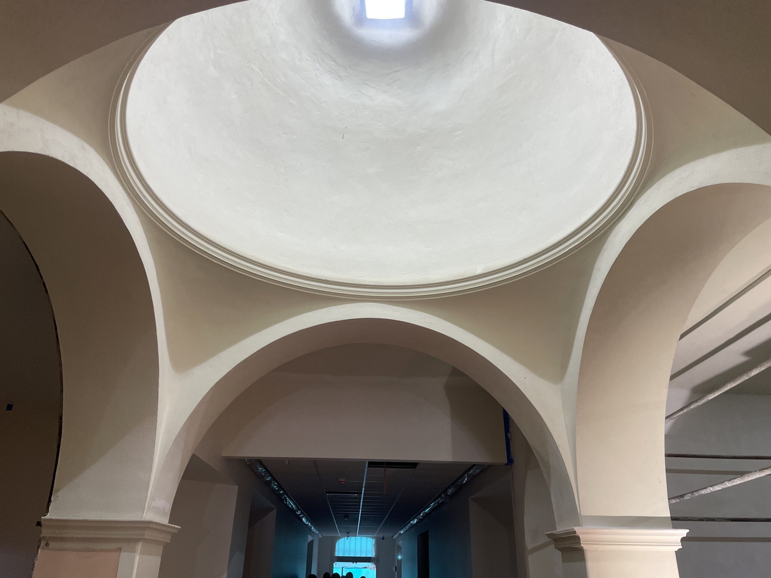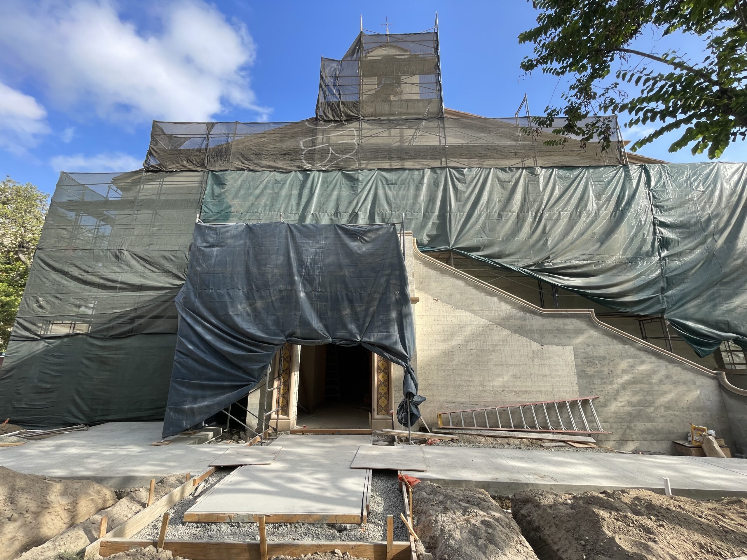 Repairs to the exterior plaster are continuing around the building and on the interior lobby. Paint removal on the west facade is pending coordination; once activities resume, tiling of the lobby stairs will be completed.