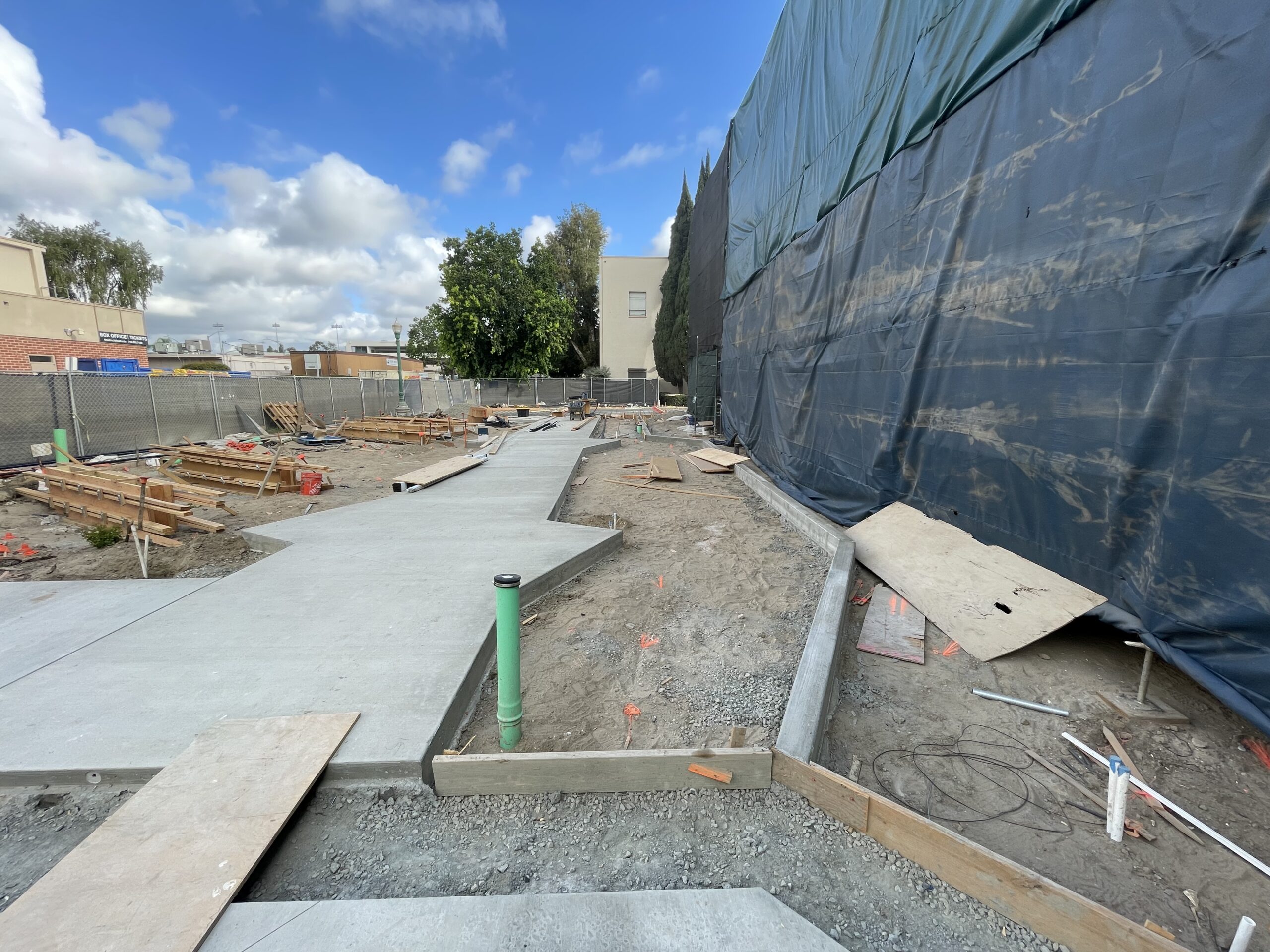 The installation of shut-off valves is ongoing, pending responses to requests for information (RFIs). Additionally, work on the south and west sidewalks commenced by the end of July and finished in early August, followed by the installation of the fire lane.