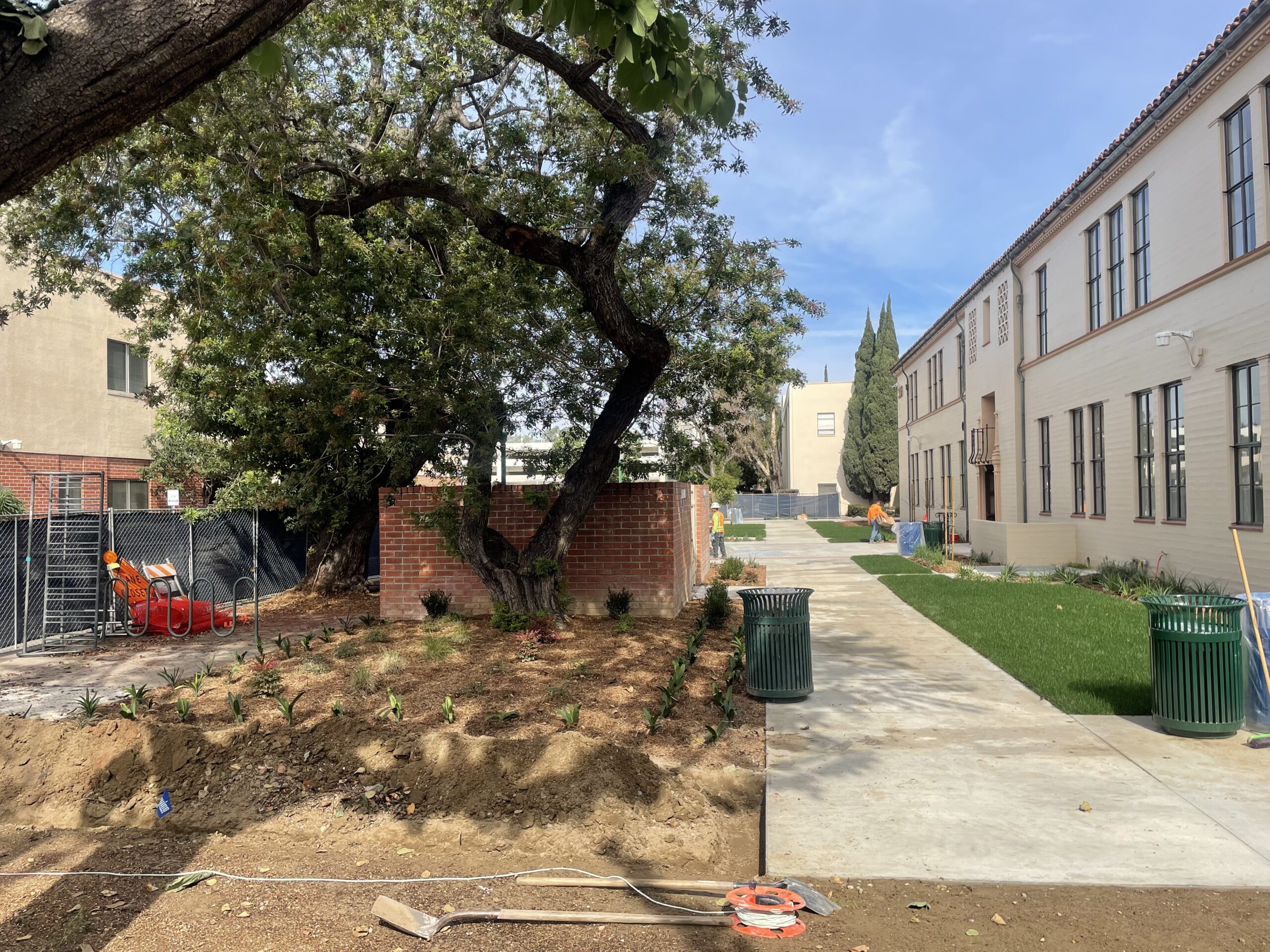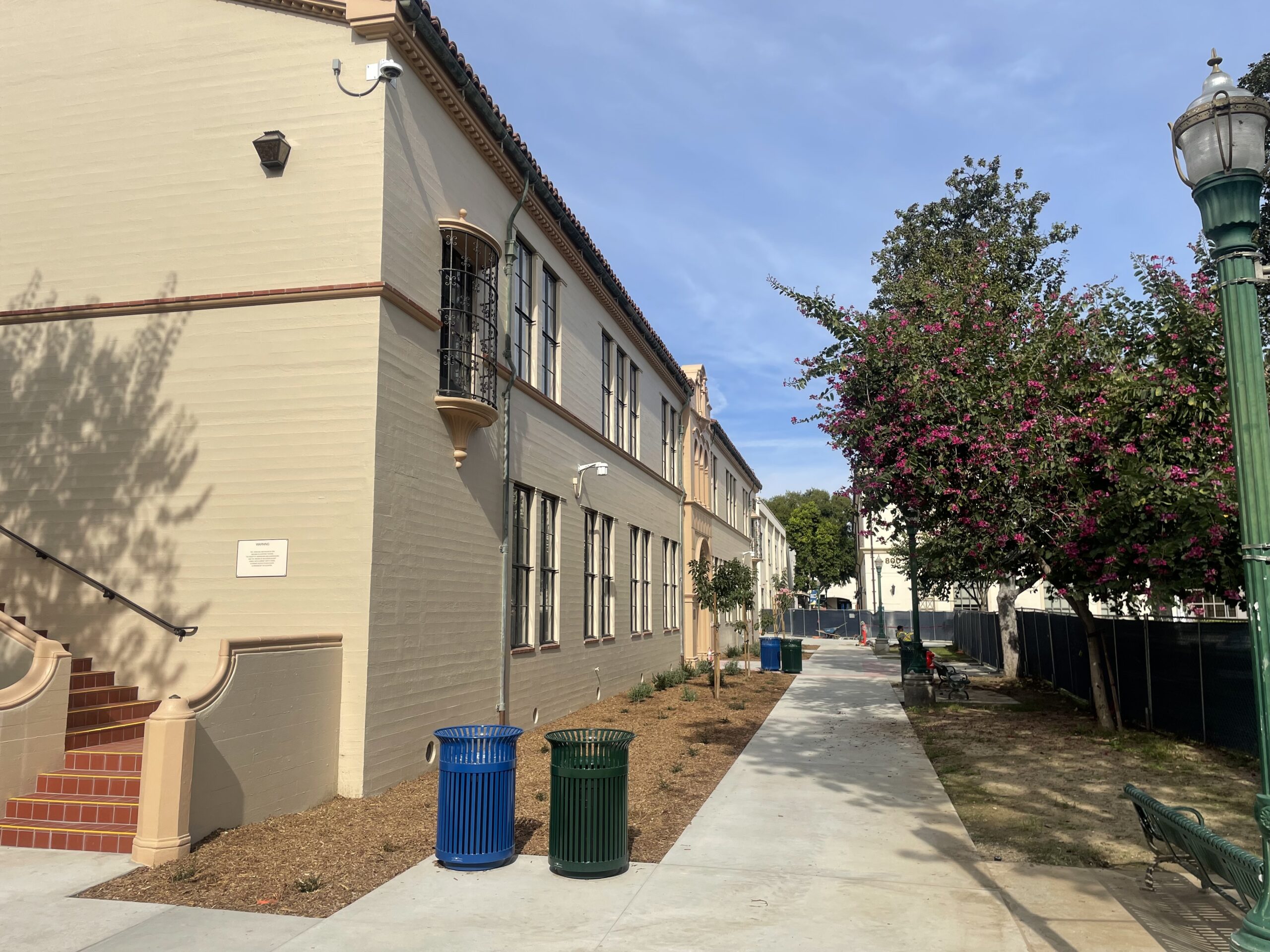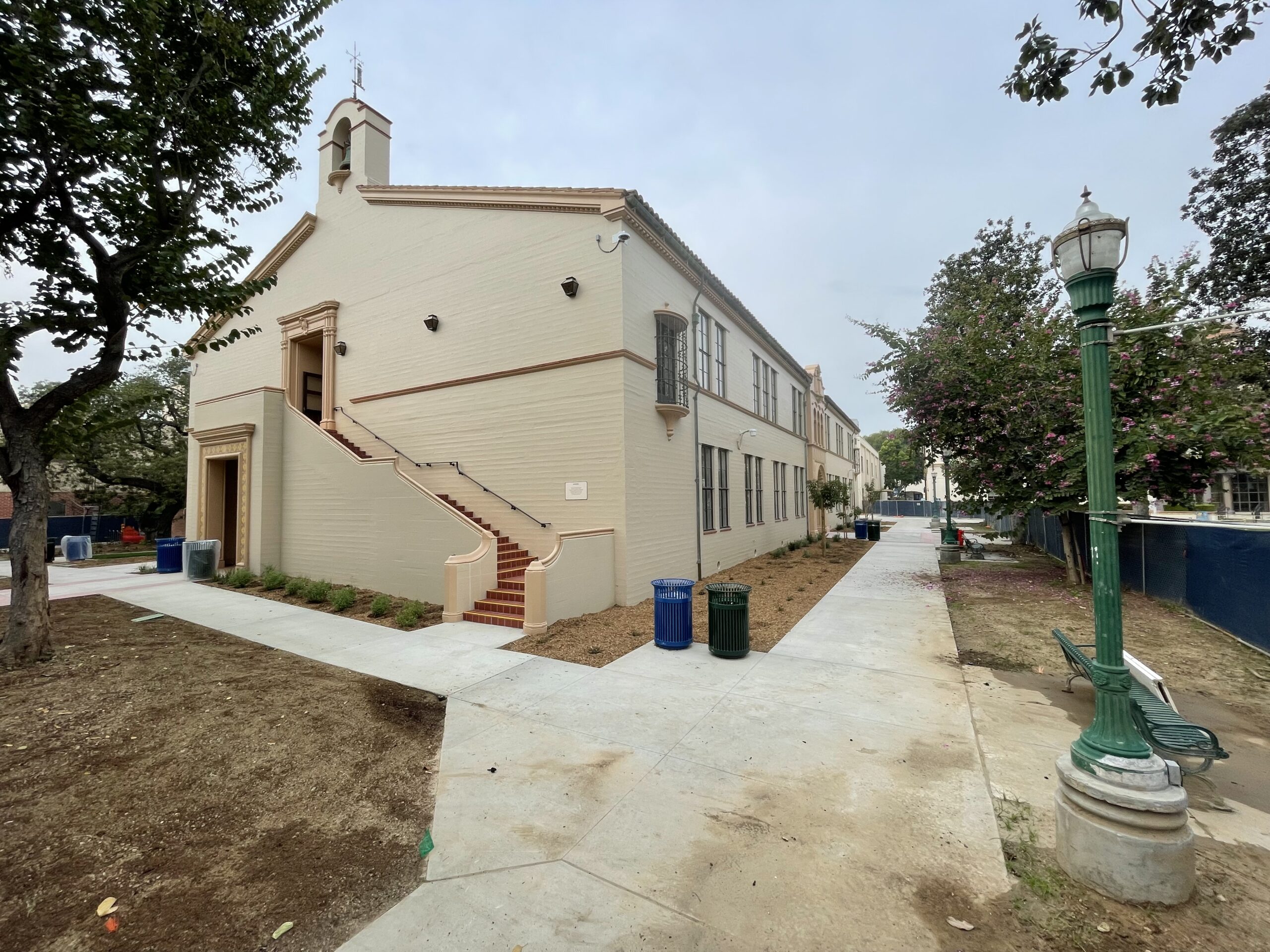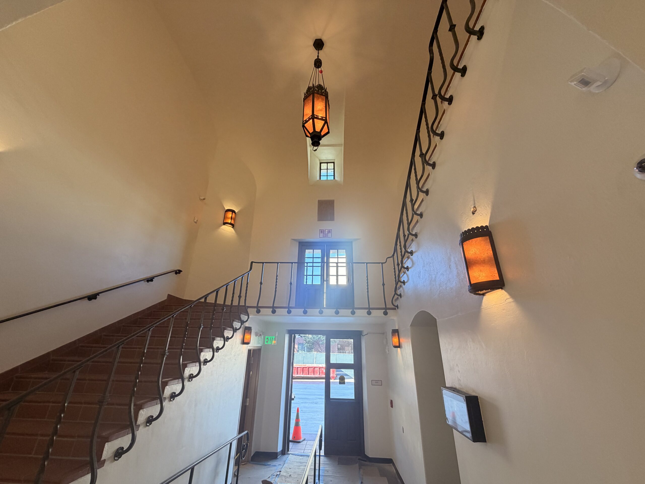 Historical restoration dome repairs were successfully completed in early December. Work on the exterior and lobby tiles also concluded. Stair nosing was delivered and installed on the west staircase. Concrete pours for sidewalks and courtyard skate stoppers placement took place in the third week of December, alongside the completion of irrigation and minor planting around the building. Stairway and ramp railings were completed, and Americans with Disabilities Act (ADA)-access buttons on the exterior doors were set in place. Punch-list walks for the hardscape scope of work took place in the second week of December.