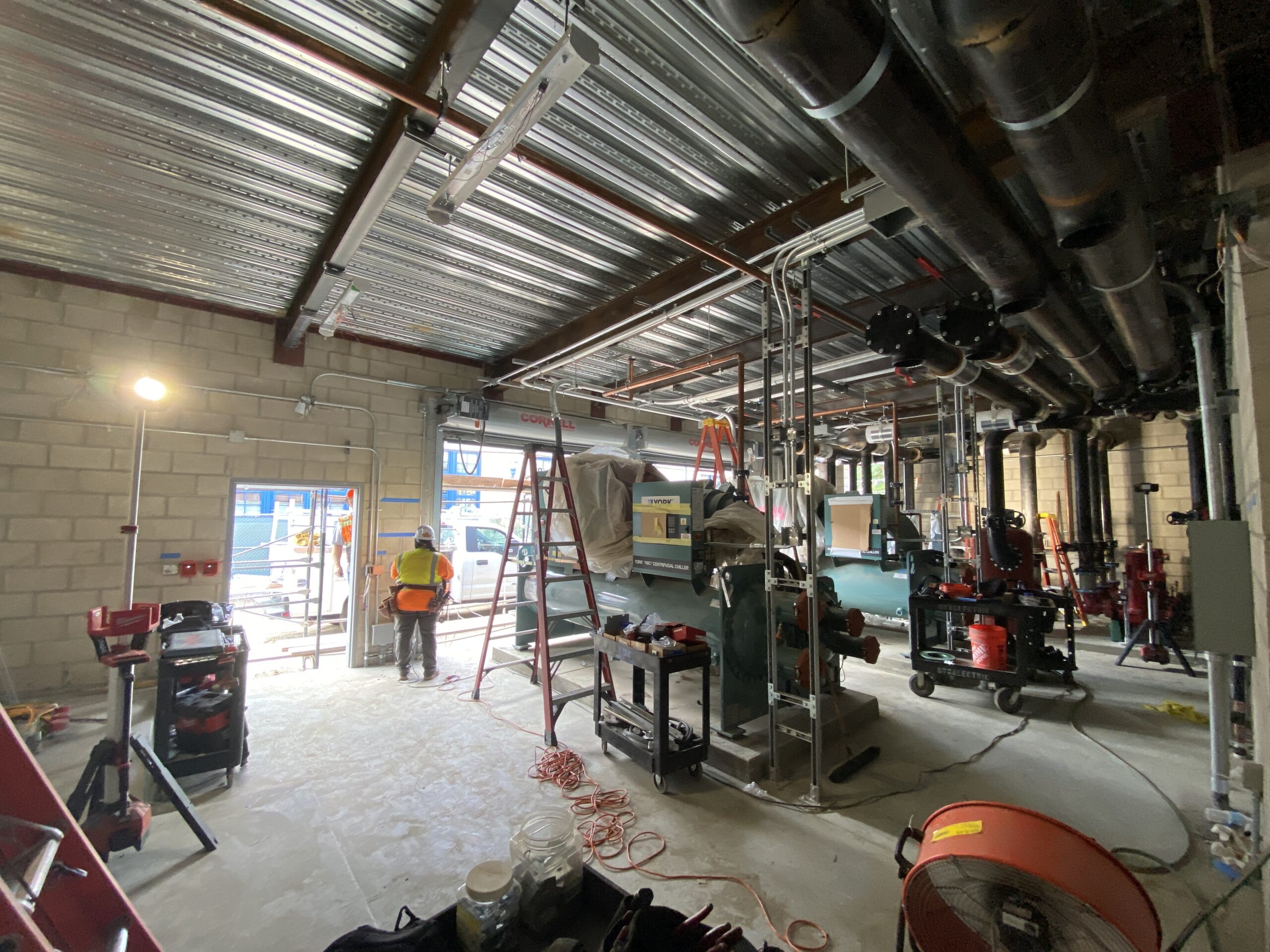 Exterior conduit runs for the chiller building and compressor rooms will start in the third week of July and finish in the fourth week. Additionally, the trenching and installation of the underground mechanical water lines began in the fourth week of July.