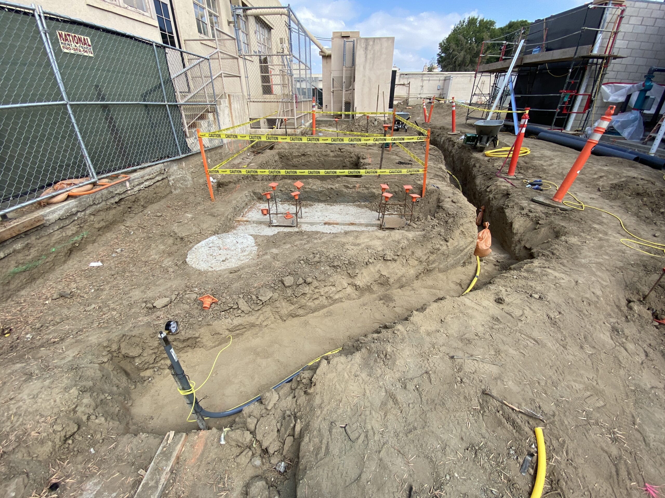 The concrete for the theater storage, compressor room, greenscreen footing, and kiln canopy have been poured. During this time, trenching and installation of mechanical water lines between increments 1 and 2 will also commence, along with the installation of mechanical lines in the mechanical room. Saw cutting for the Southern California Edison (SCE) scope of work has started with conduit installation is scheduled to begin in the last week of July.