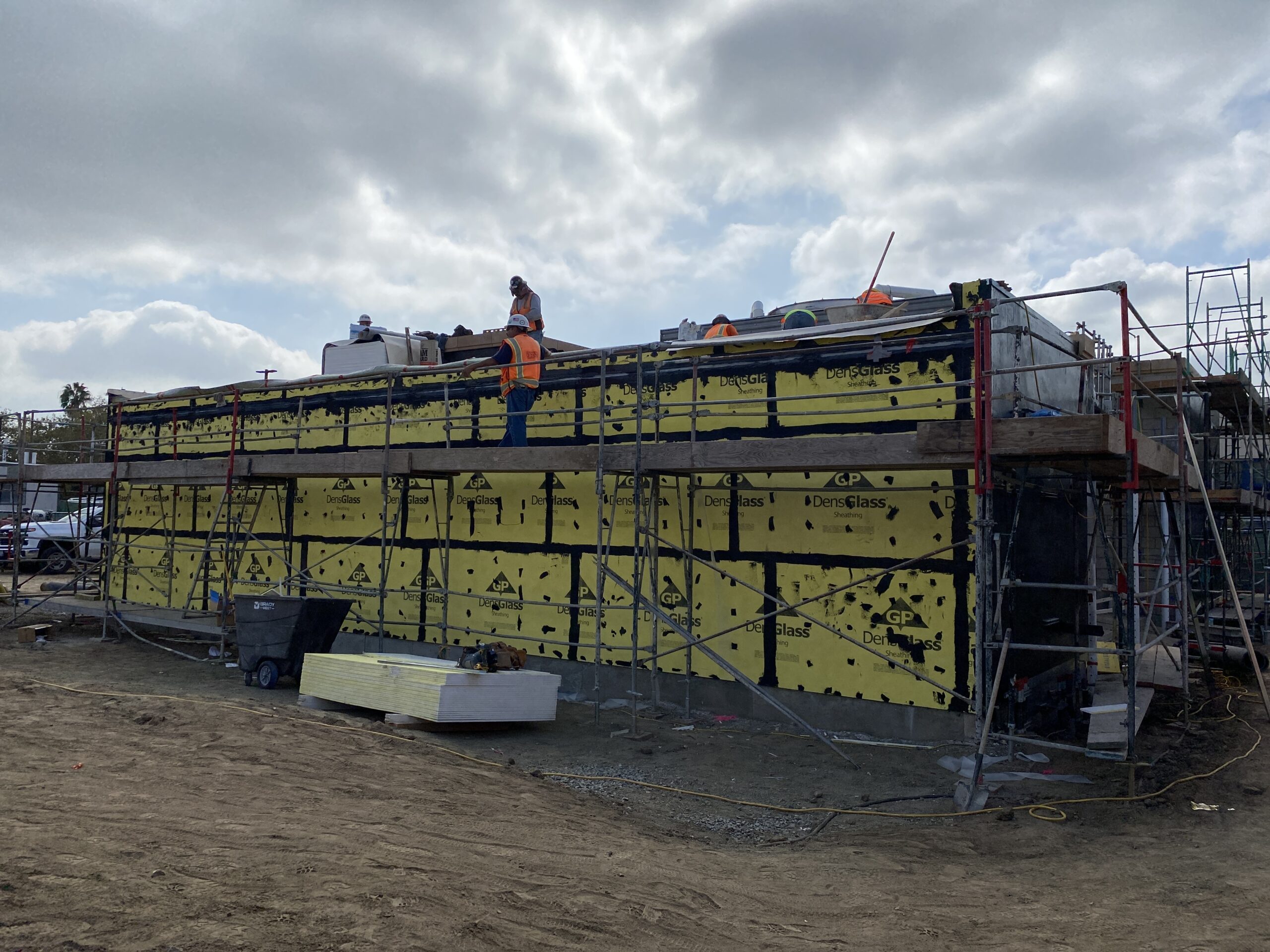 Work proceeded on the steel roof structure for the theater storage building. Following this, the remaining steel for the compressor room roof and canopy is expected to be completed by the end of the month. Scaffolding is set up on the exterior of the building in preparation for the stucco plaster installation, which commenced in the second week of August.